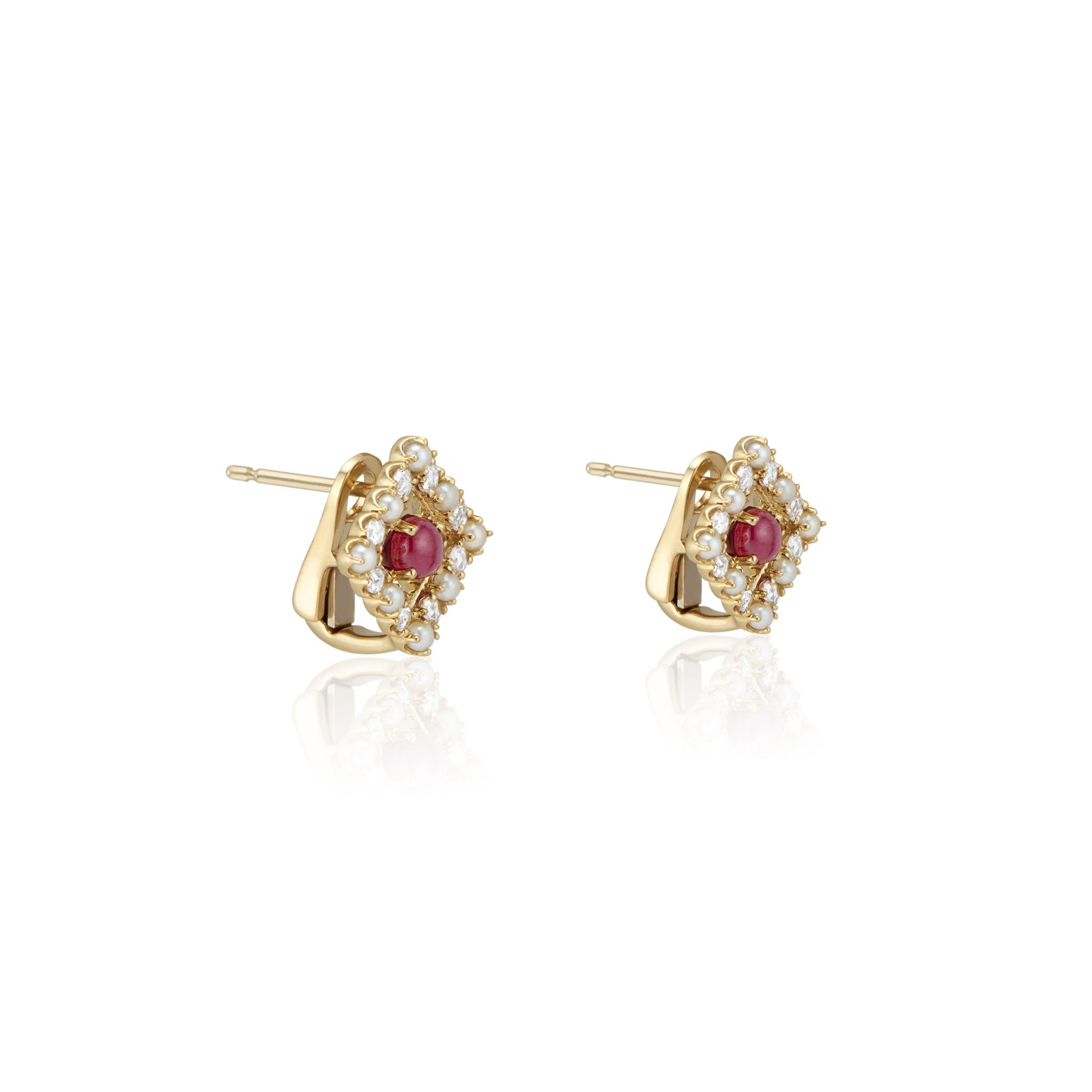 حجر ياقوت أحمر محاط بصف مرصع بألماس قصة الروز ولؤلؤ الأكويا. أقراط بمشبك ذات صحيفة مصقولة عاكسة تضم أحجاراً تضفي على أذنيك زينة براقة.